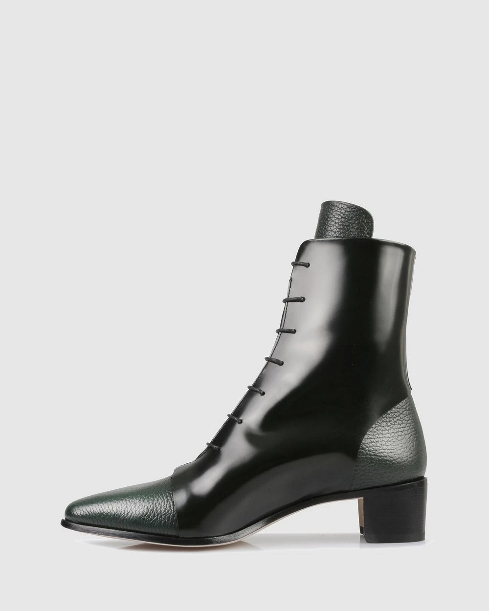 Crafted by skilled artisans in Italy, the Bastille Ankle Boots by Beau Coops evoke a refined and modernised Victorian inspired aesthetic. Made from luxurious leathers, they are snug around the ankle and calf and feature a pointed toe, a unique layering effect of textured leathers, a high tongue, and rest on a leather stacked mid block heel.