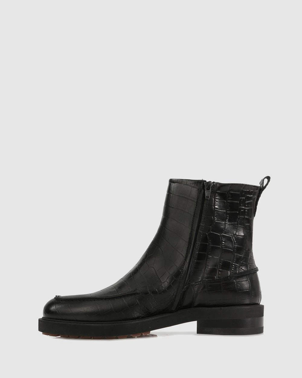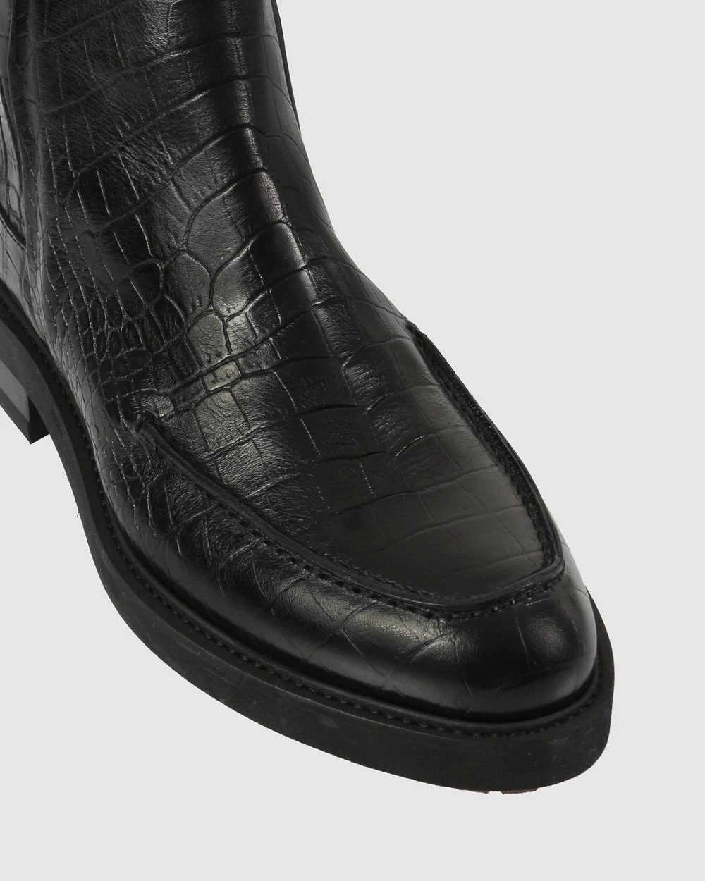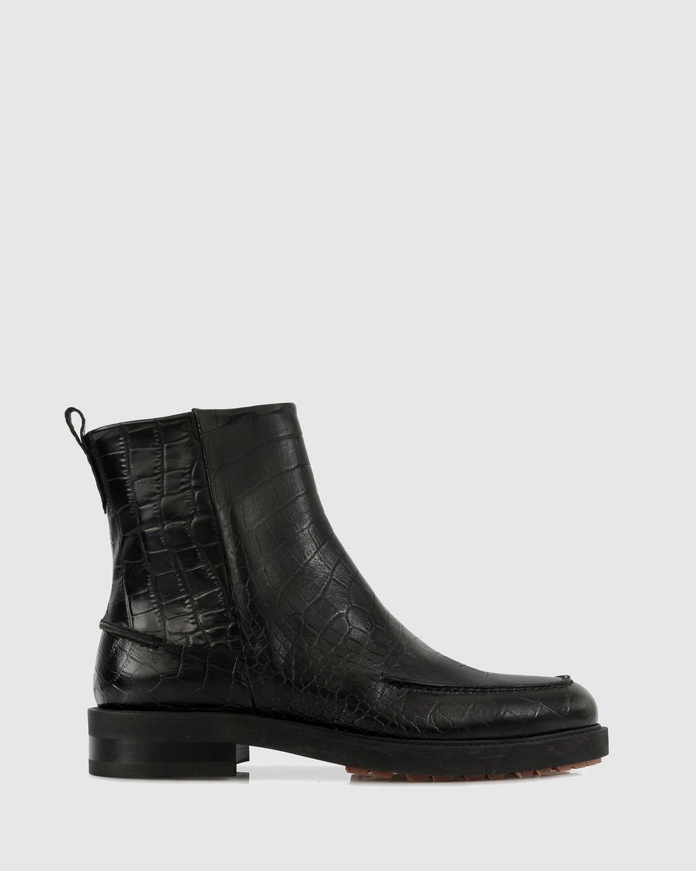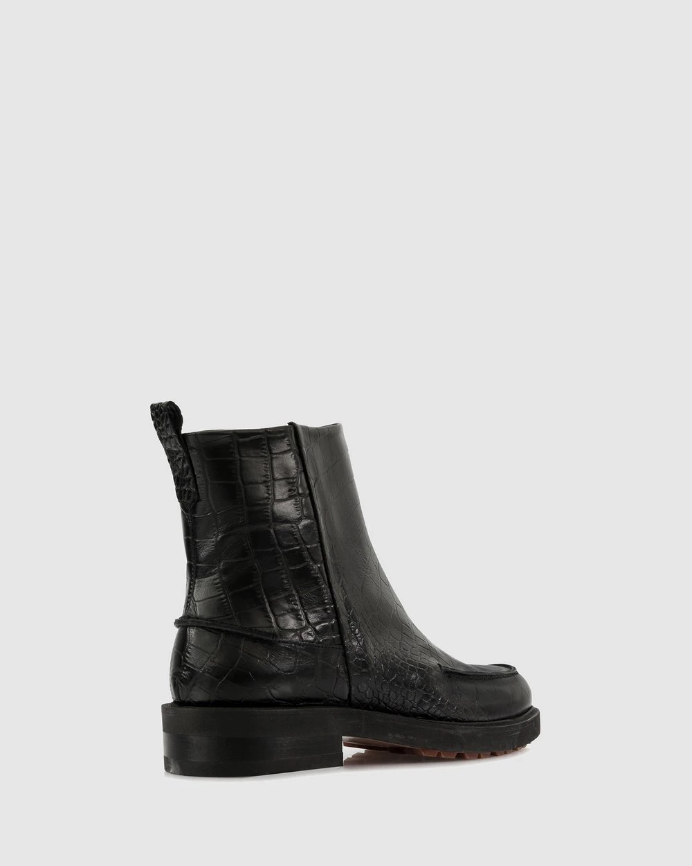 The Bocking ankle boots by Beau Coops are made in Italy, with printed croc leather in classic black or worm tan. A take on the workerman’s boot with a chunky, pointed toe, low block heel, and pull-tab at the back of the raised shaft. Take no grief this Autumn with the no-nonsense Bocking boot.
