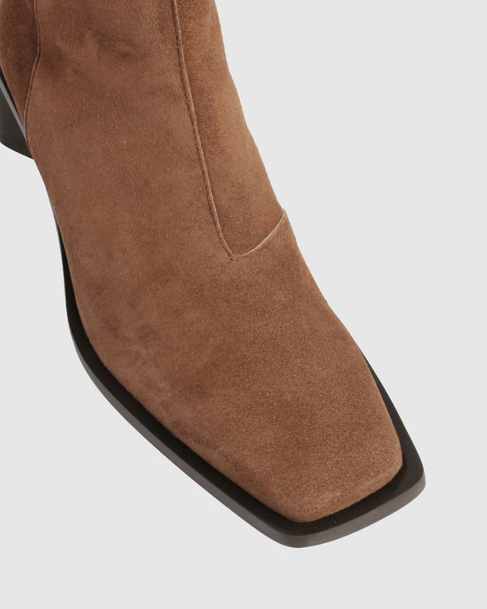 -Made in Italy-Suede leather upper-Rich tan hue-Asymmetric leather sole-Geometric heel-Inner zip-Square toe-Leather lining and insole