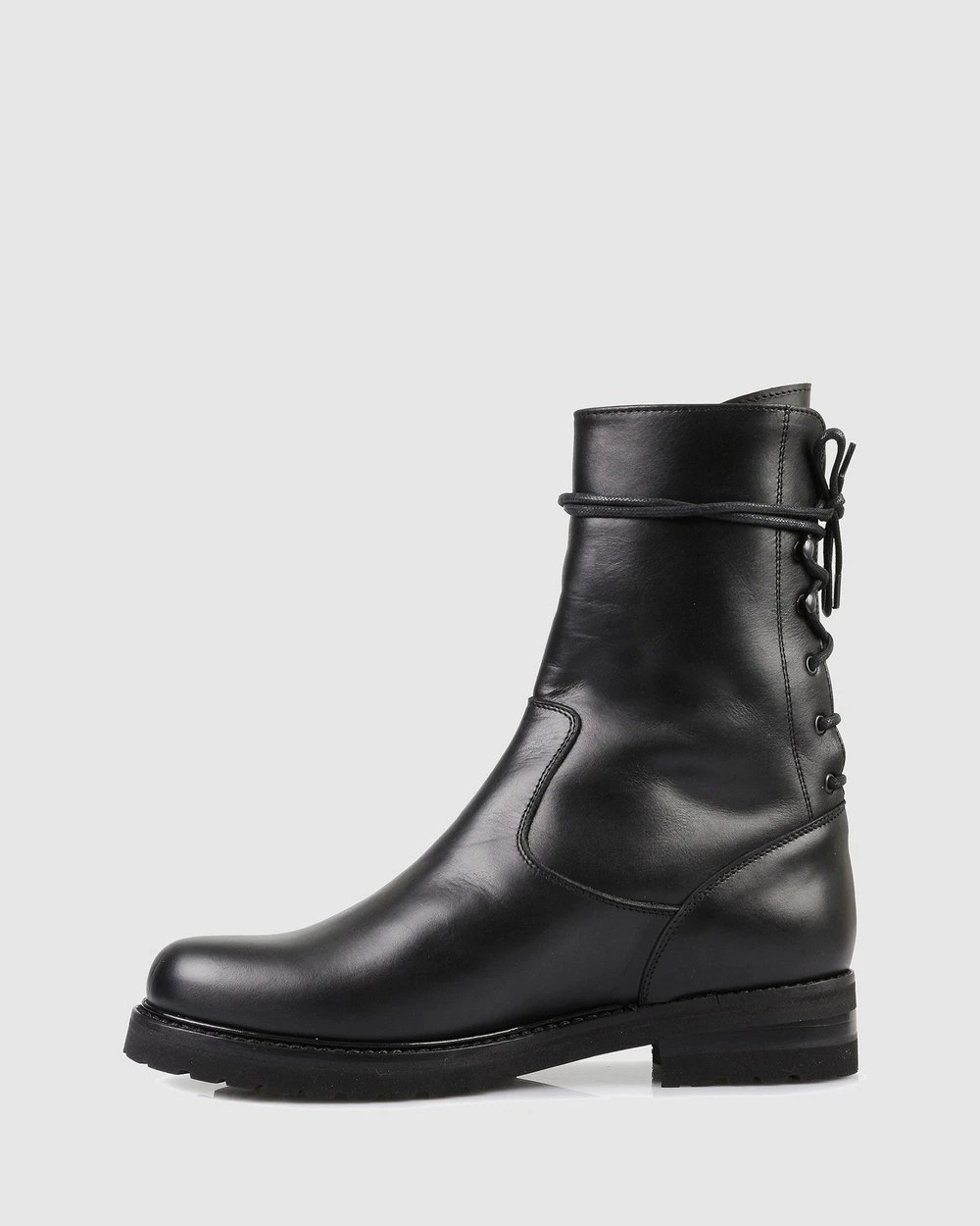 Handcrafted in Italy in smooth calf leather, the Concorde Ankle Boots by Beau Coops are the perfect every day boot-rain hail or shine. They feature adjustable cotton laces along the back for ease and comfort, a round toe, and are set on a hard wearing trek sole with a leather stacked insert in the heel.