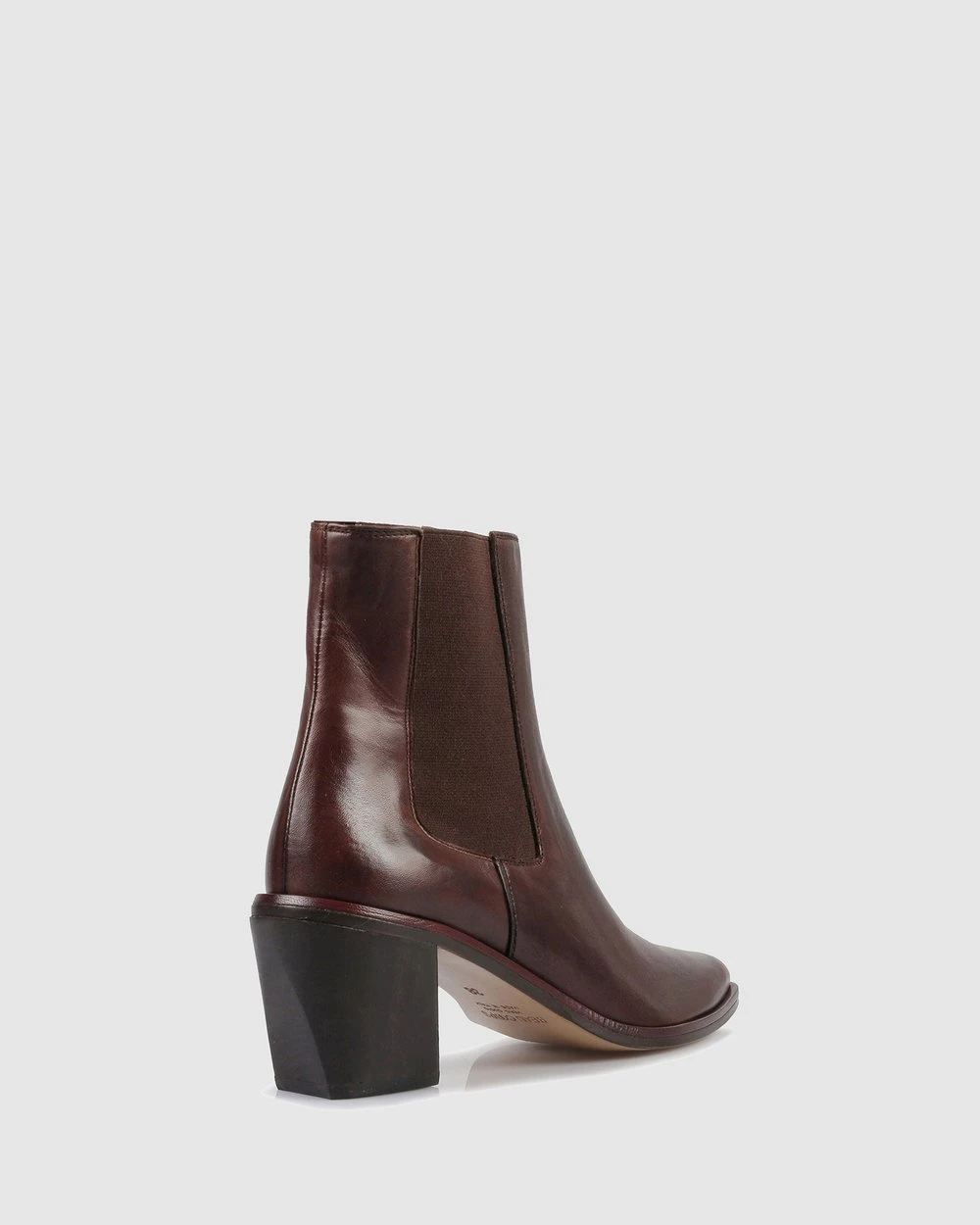 -Made in Italy-Rich dark brown color-Back pull tab-Veg tanned leather upper-Almond shape toe-Leather covered randing-Elasticated side gussets-Leather stacked block heel-Leather lining and insole-Leather sole