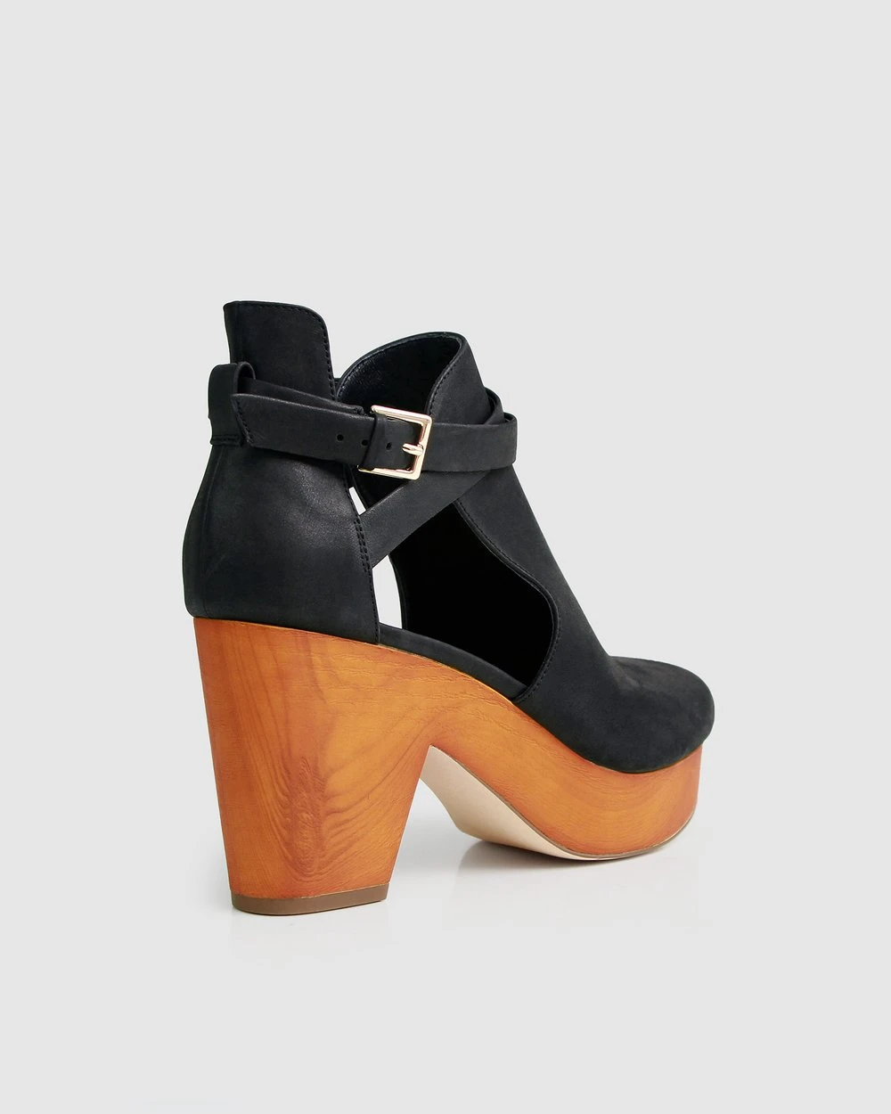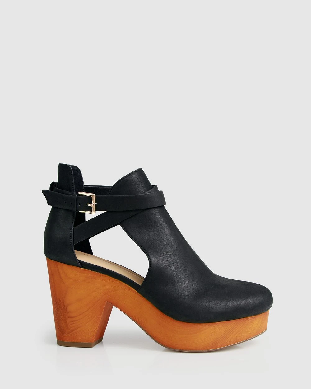 Classic clog styling gets an update in this stylish 70’s inspired ankle boot, lifted by a woodgrain platform and heel. The Fearless Clog Ankle Boot by Belle and Bloom features edgy side cut-outs and is finished with adjustable crossover ankle straps.