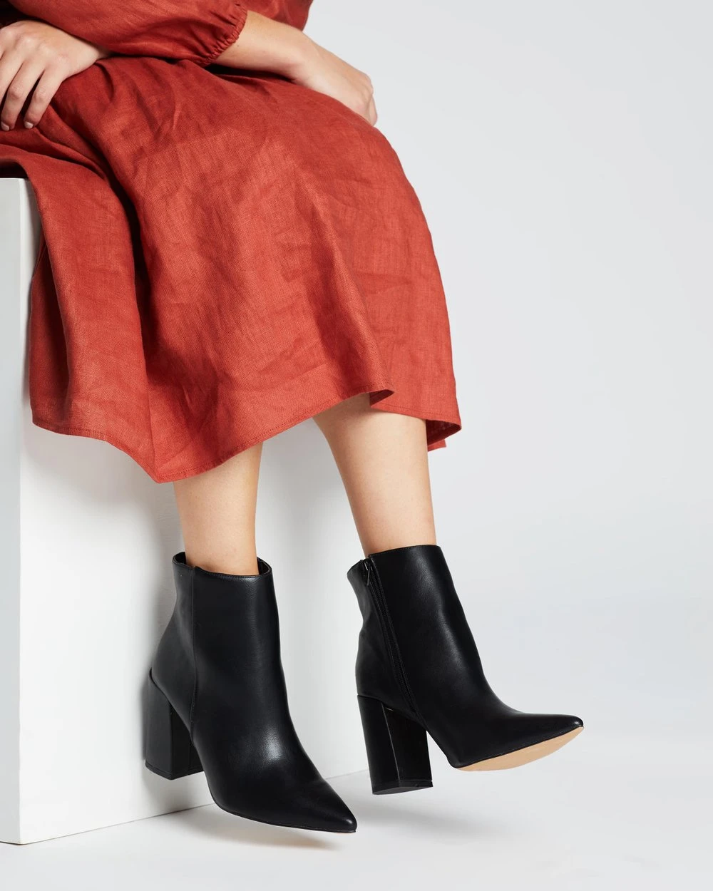 Make the latest fashion trends all your own with Australian label Dazie. The Irvine Ankle Boots are the perfect everyday pair with their smooth black finish and chic pointed toe.