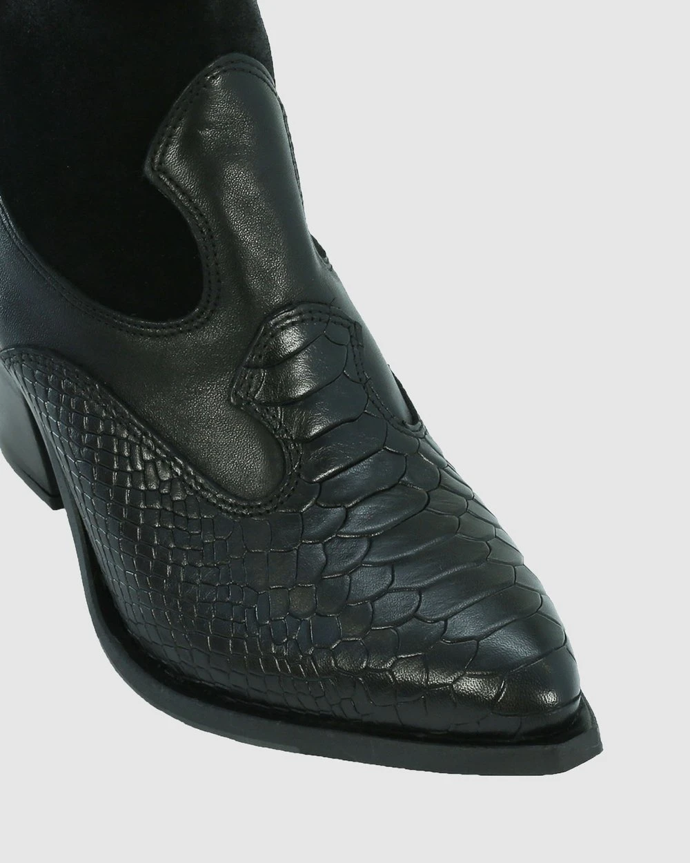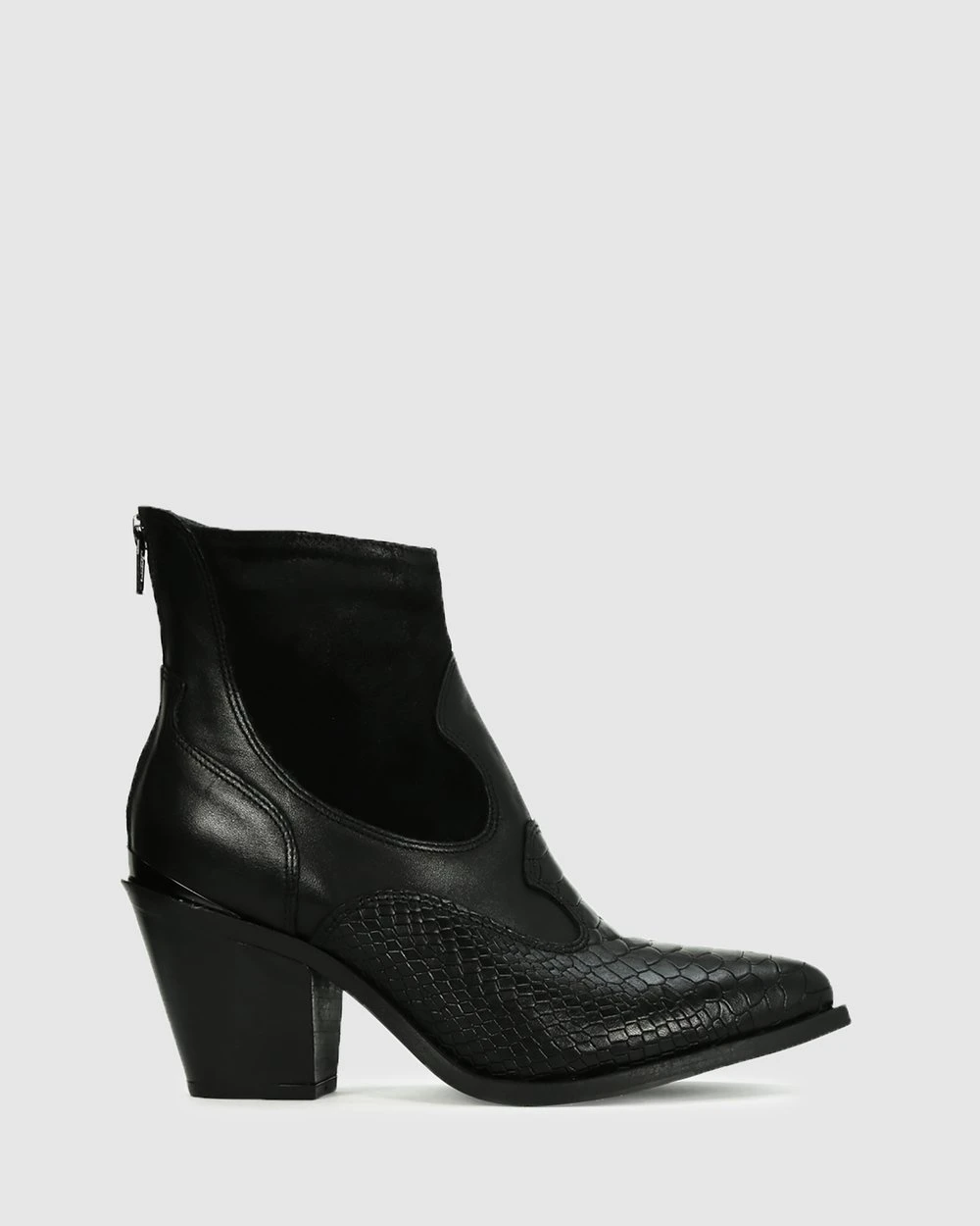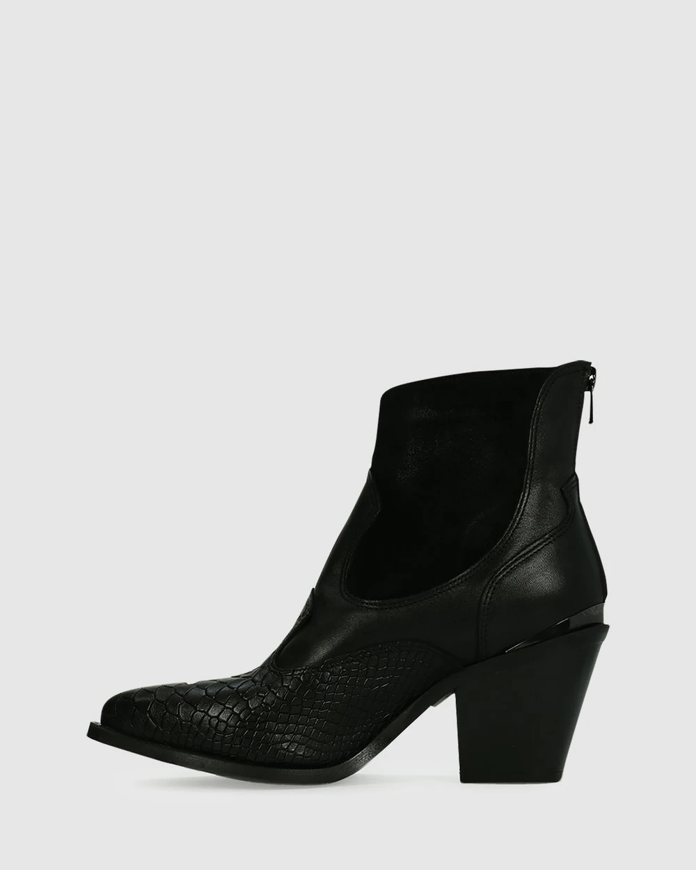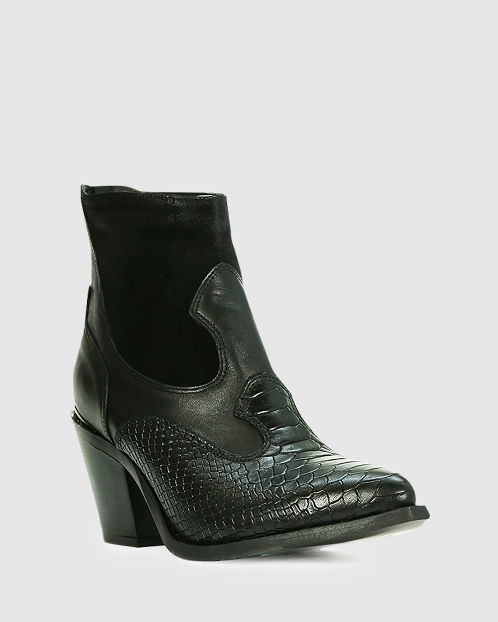 – Italian Leather luxury – Western style cut – Inspired multi leather textures/emboss – Metallic heel accessory – Back zip easy wear – Polished leather stack heel- EOS favourite boots