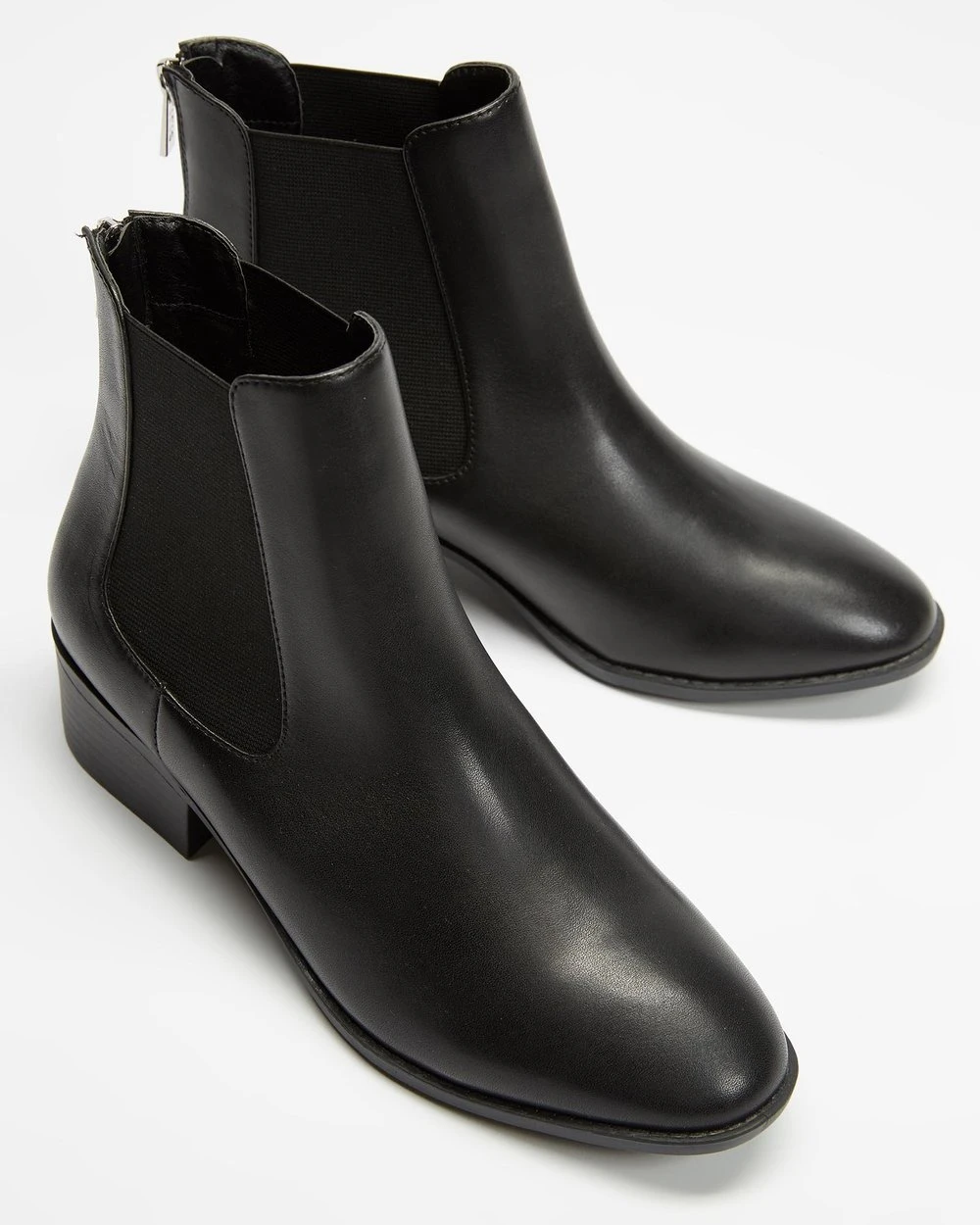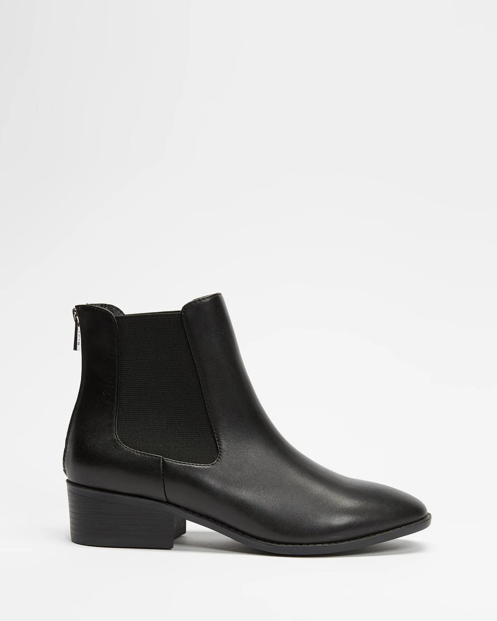 Stay on-pace with the latest in the Rory ankle boots from IRIS Footwear, boasting a faux wooden block heel and sleek-textured leather to complete the Chelsea-inspired silhouette.