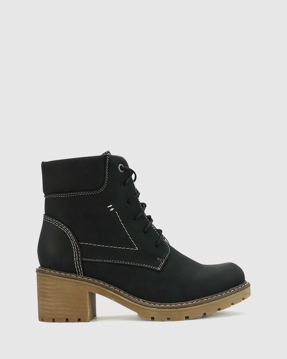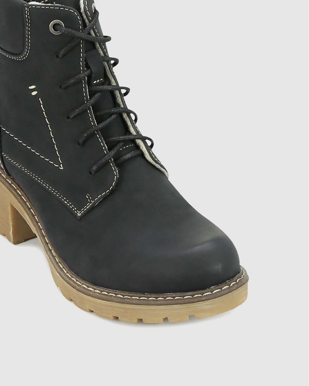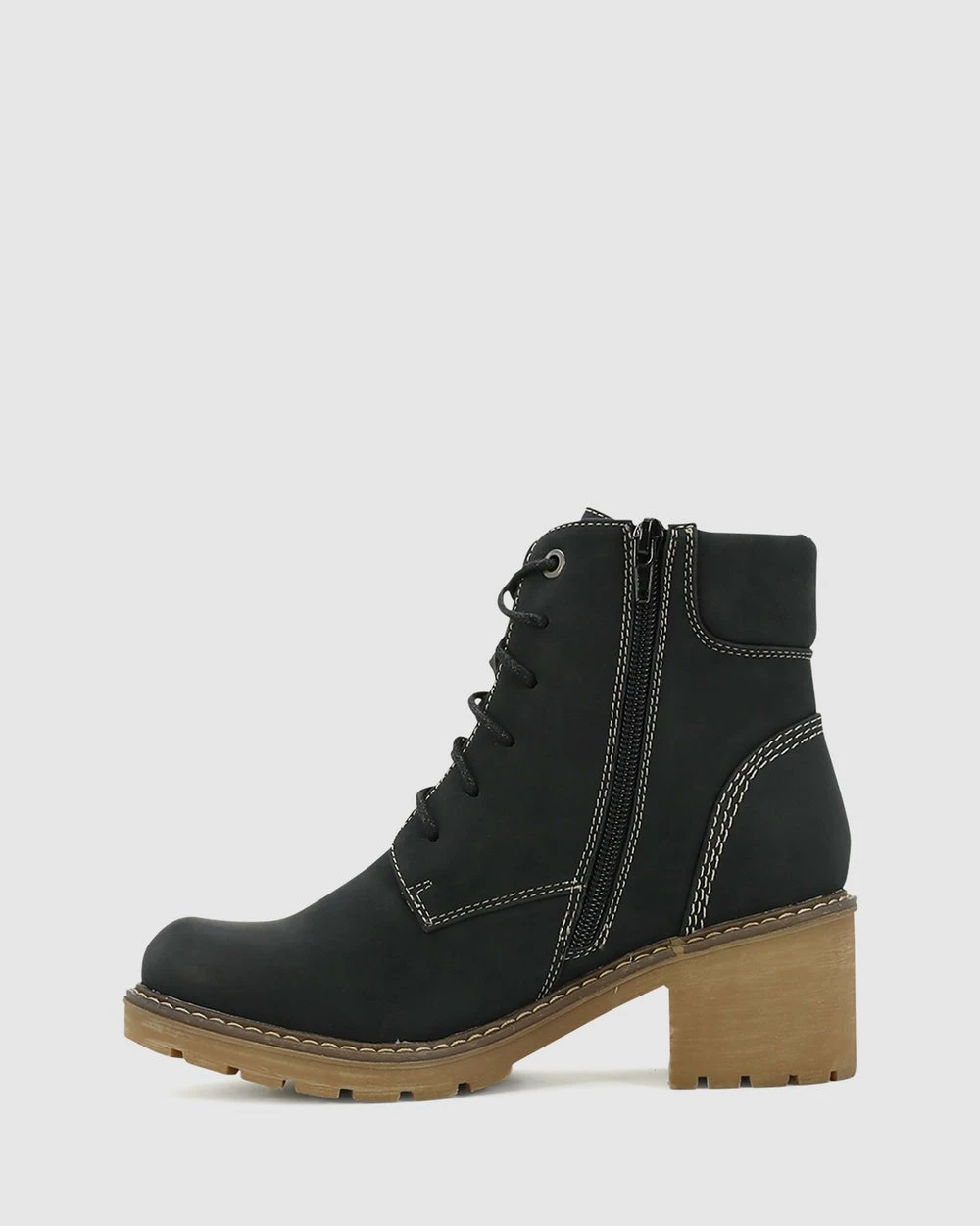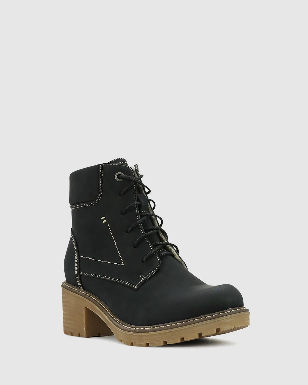 Walk in power and confidence with the tough, stylish Los Cabos ELI. This lace up mid ankle boot sports statement stitching along the counter and quarter and features a chunky heel for extra support and a rounded toe for comfort, balance, and visual appeal.