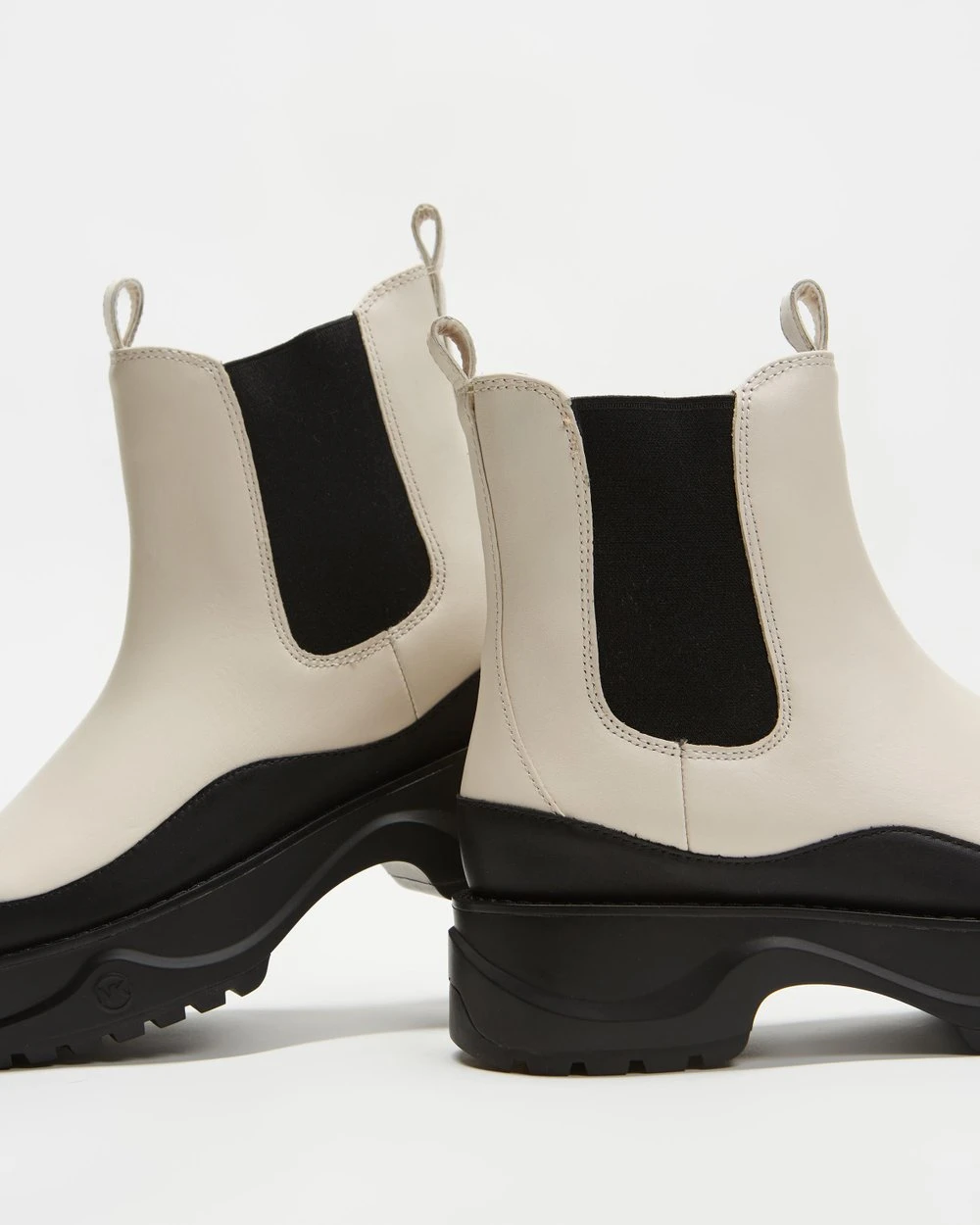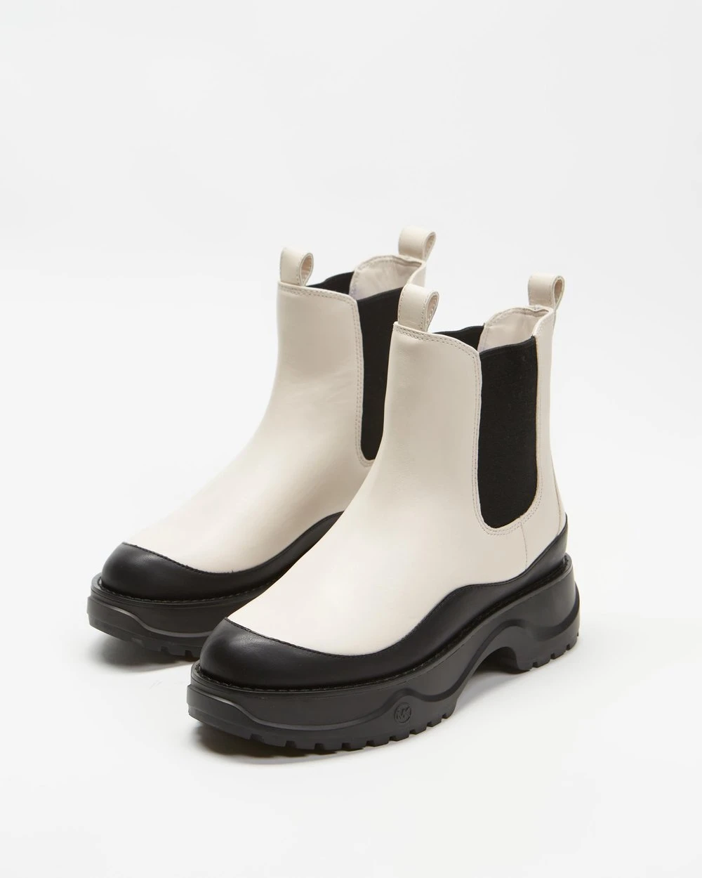 Designer Michael Kors is an icon of American fashion, and his eponymous brand is renowned around the world for its premium accessories and clean, sports-inspired aesthetic. In a two-toned design contrasting creamy neutral leather with classic black rubber, the chunky Dupree Booties are an edgy take on the classic Chelsea boot silhouette.