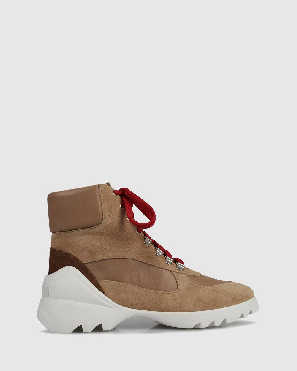 Taking cues from the traditional hiking boot, the Emmy Ankle Boots by Sempre Di are made from a combination of suede and nappa leather and are set on a chunky white tread sole. They feature silver D rings and red laces, and a leather padded collar and lining for optimum comfort.