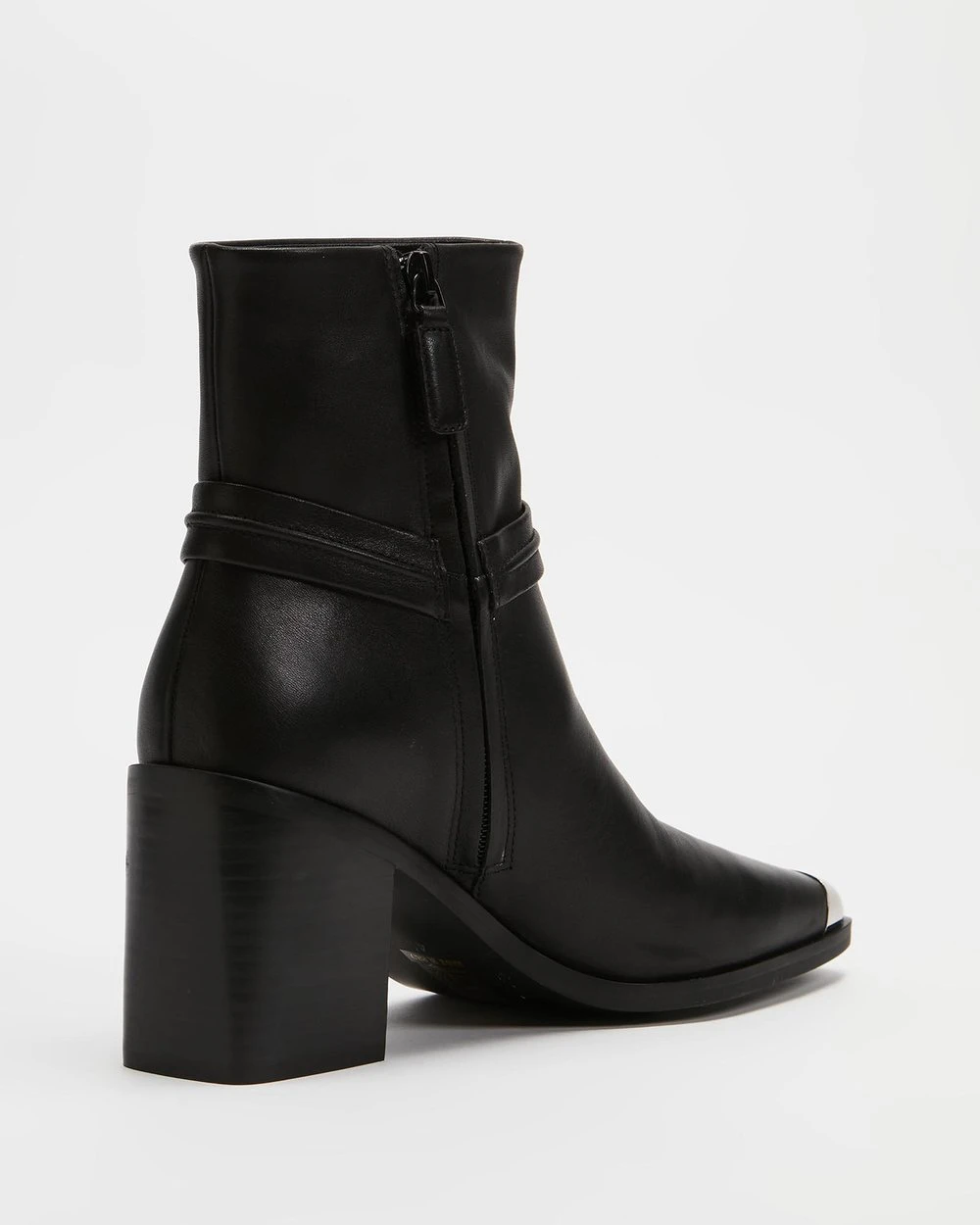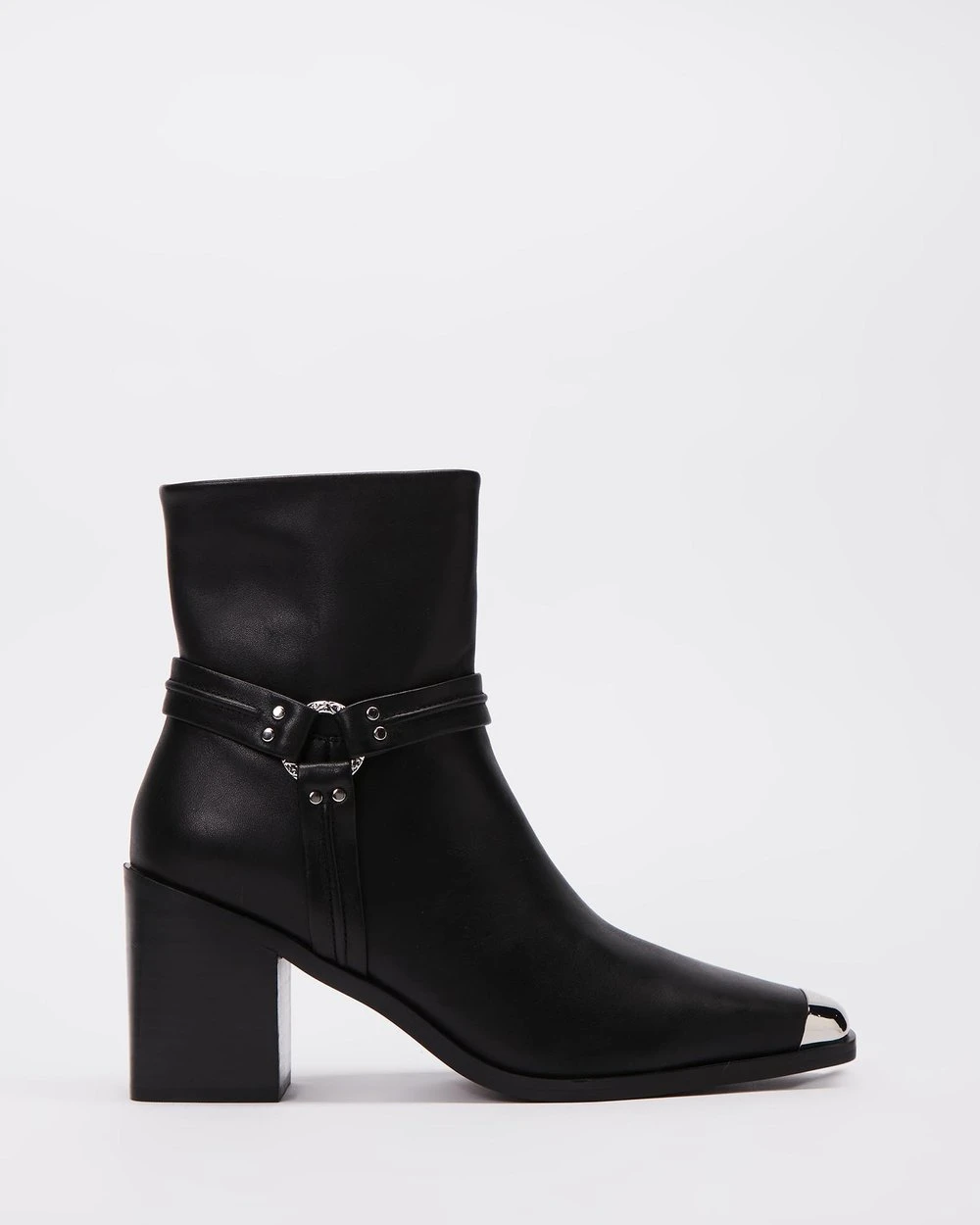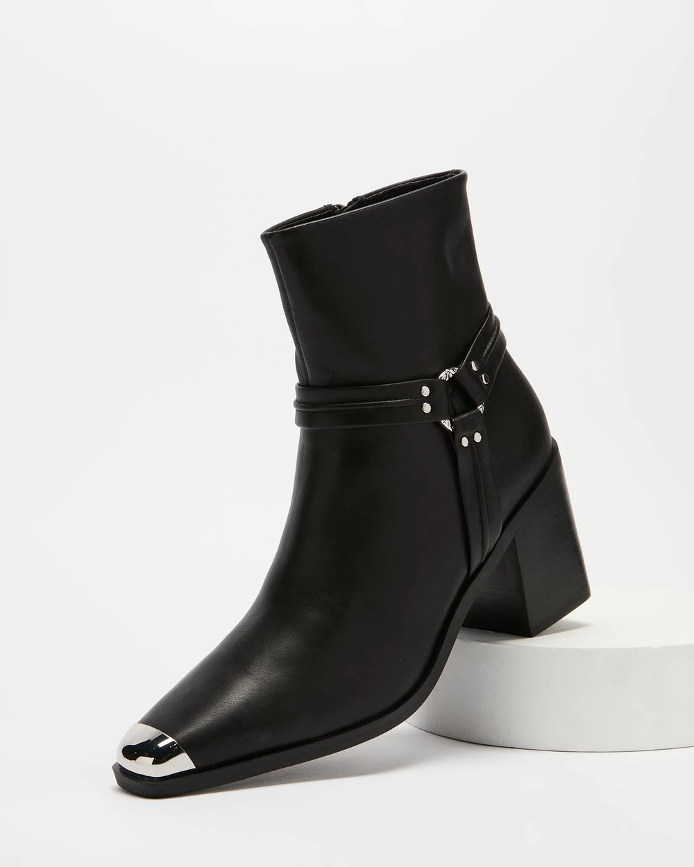 The Hunnyankle boots from Senso are defined by a silver-toned metal toe cap and harness-style overlay to the ankle.