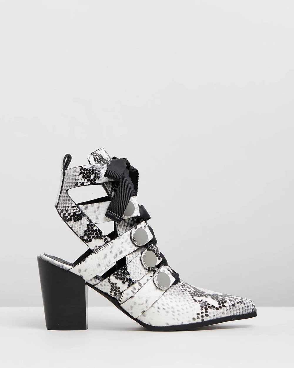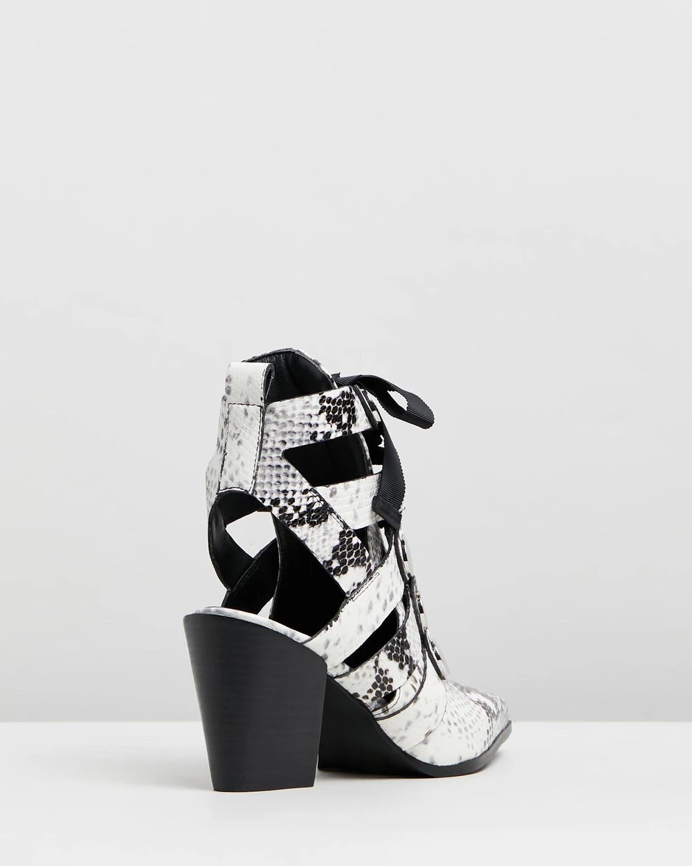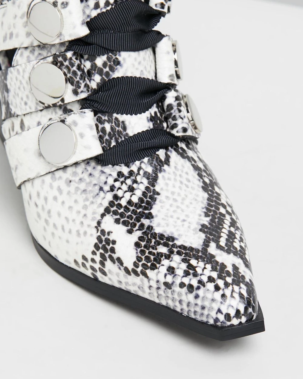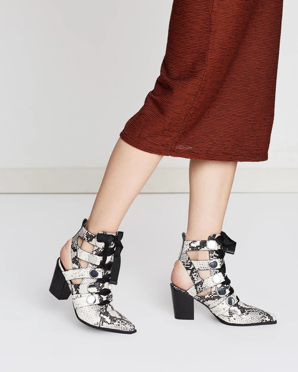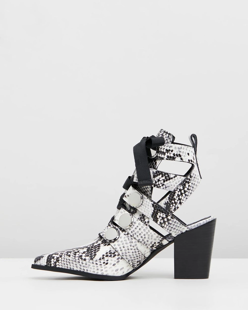 Australian label Senso lend a contemporary update on heeled boots with the Quinetta II, crafted from snake-print leather with a grosgrain lace-up front and set on a block heel.