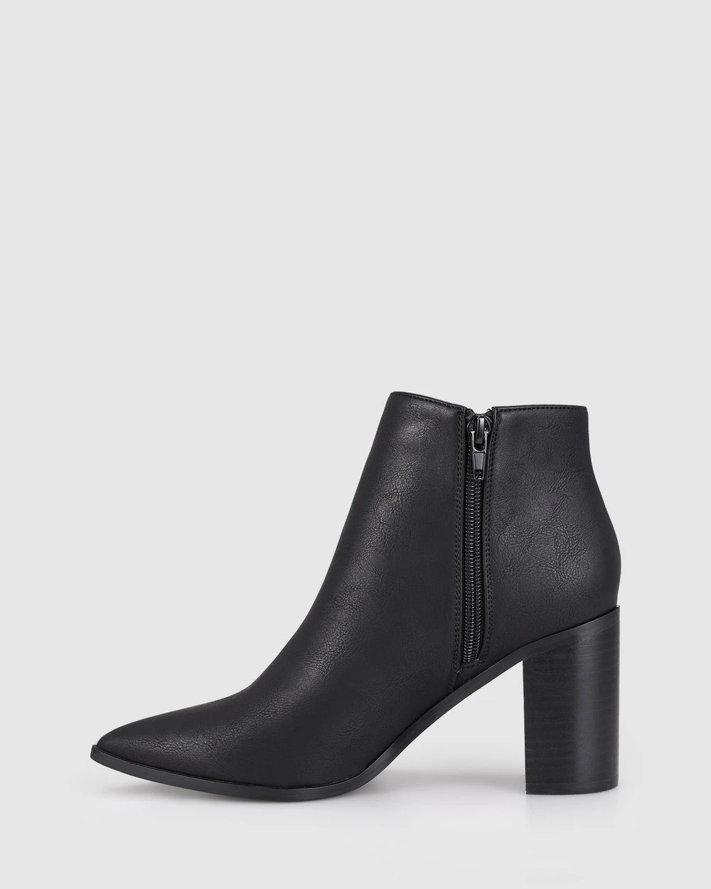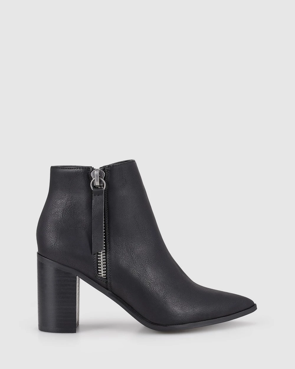 – Features: Pointed toe shape, soft textured finish, stacked block heel, outer zip detail.