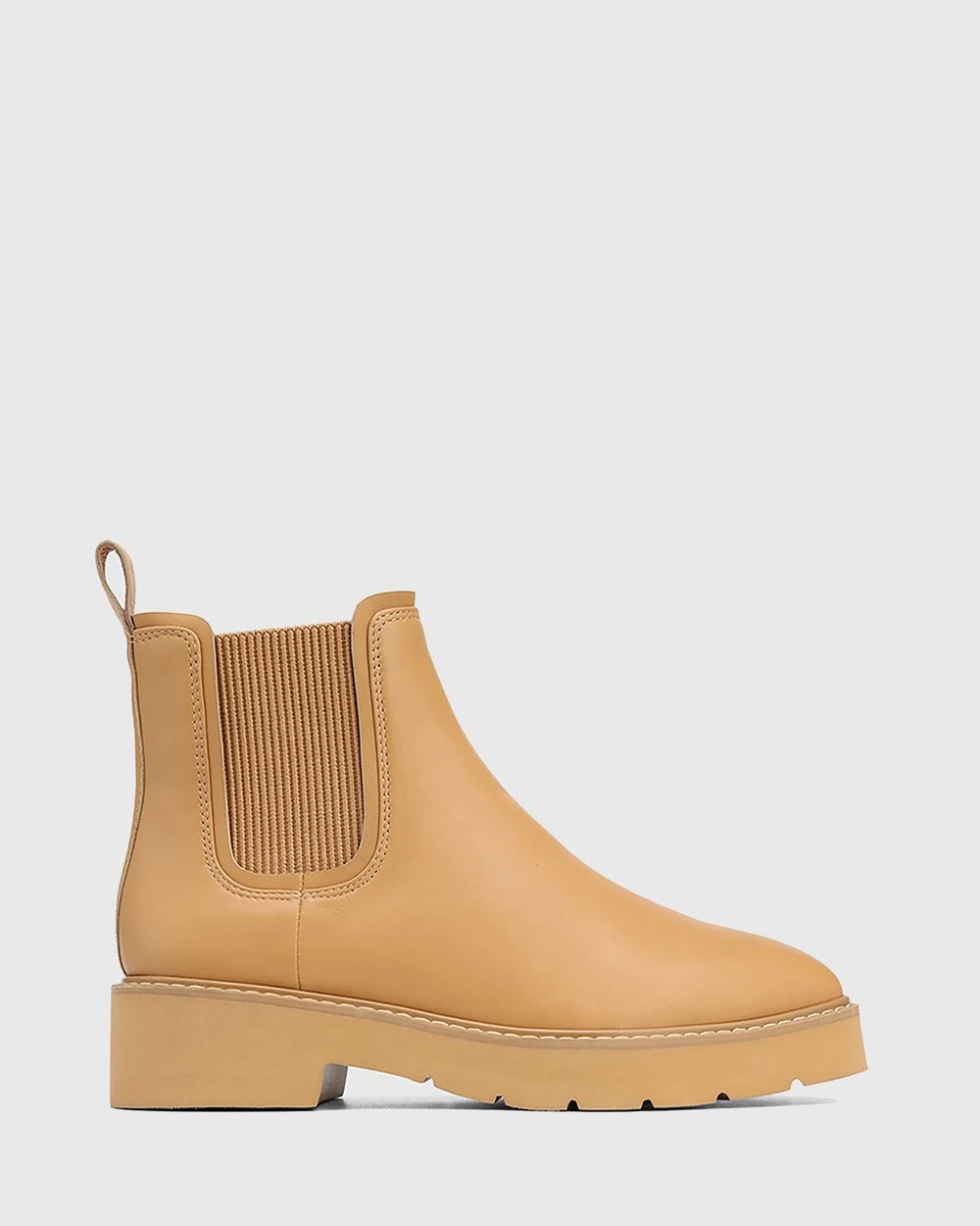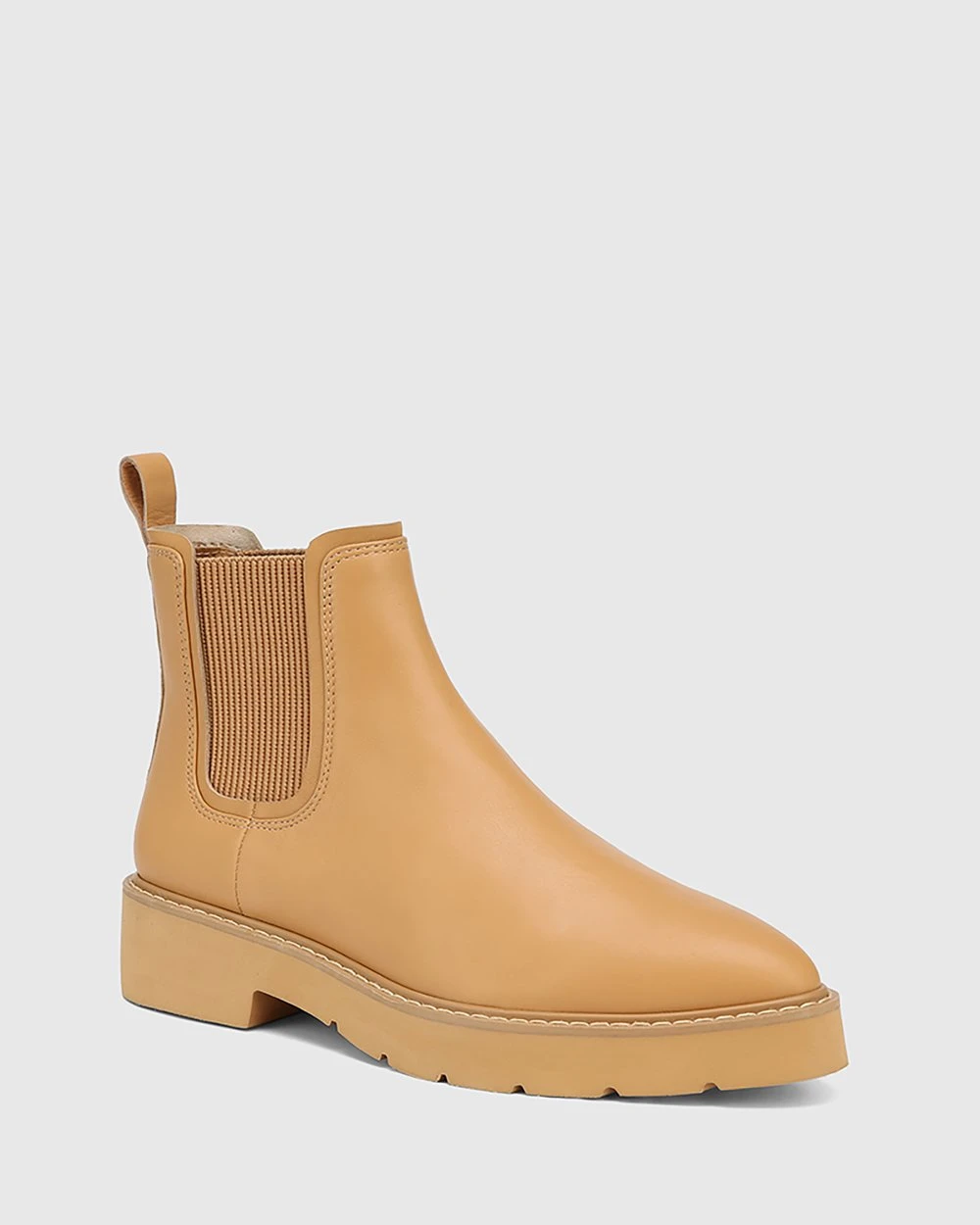 The Comika Leather Rubber Sole Ankle Boots by Wittner in camel feature a chunky sole, offset by a pointed toe.